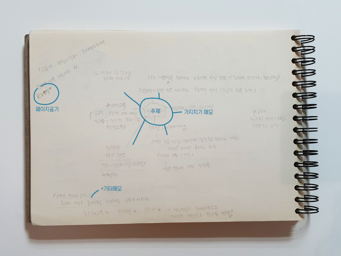 책을 읽을 때는 가지치기 형식만 가져와서 주제별로 정리하고 페이지를 메모해서 요점 파악을 하거나 서평 작성을 할 때 사용하는데, 이 때는 다이어리에 수기 작성으로 하는 것이 더 수월했습니다.